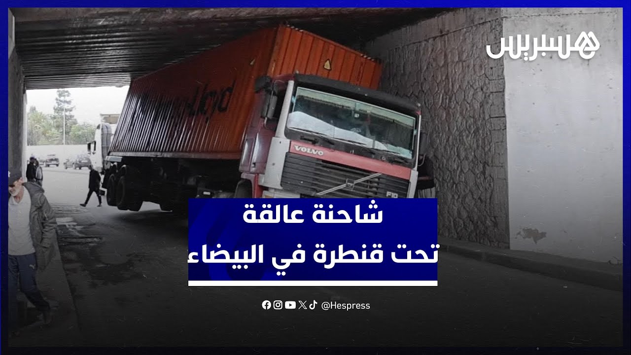 شاحنة من النوع الكبير تعلق تحت قنطرة وسط شارع رئيسي في البيضاء